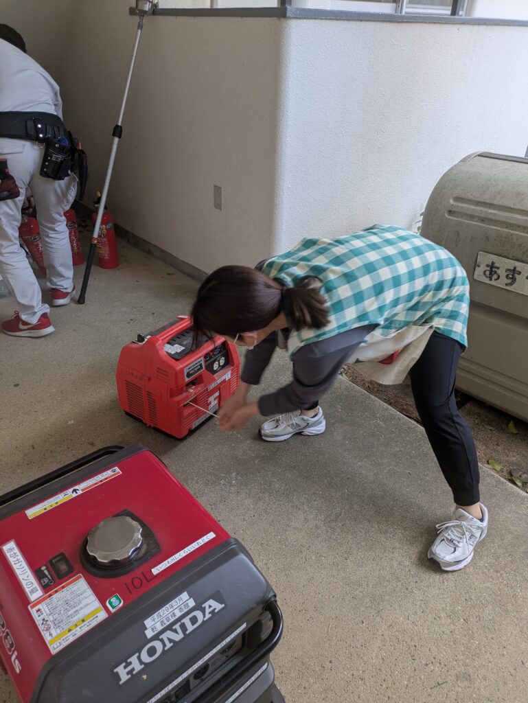 新入社員 発電機と格闘する。 今日の出来事 2026.02.26 年に数回、災害対応の為の発電機を稼働運転します。誰でも発電機が使えるように。新入社員は必ず参加です。 何度紐をひっぱってもかからない!!!大変。ガソリンくさいし…。って毎回みんなで言いながらも、毎年2回は稼働中。4月には、この電源を使って屋台を出す予定です^^